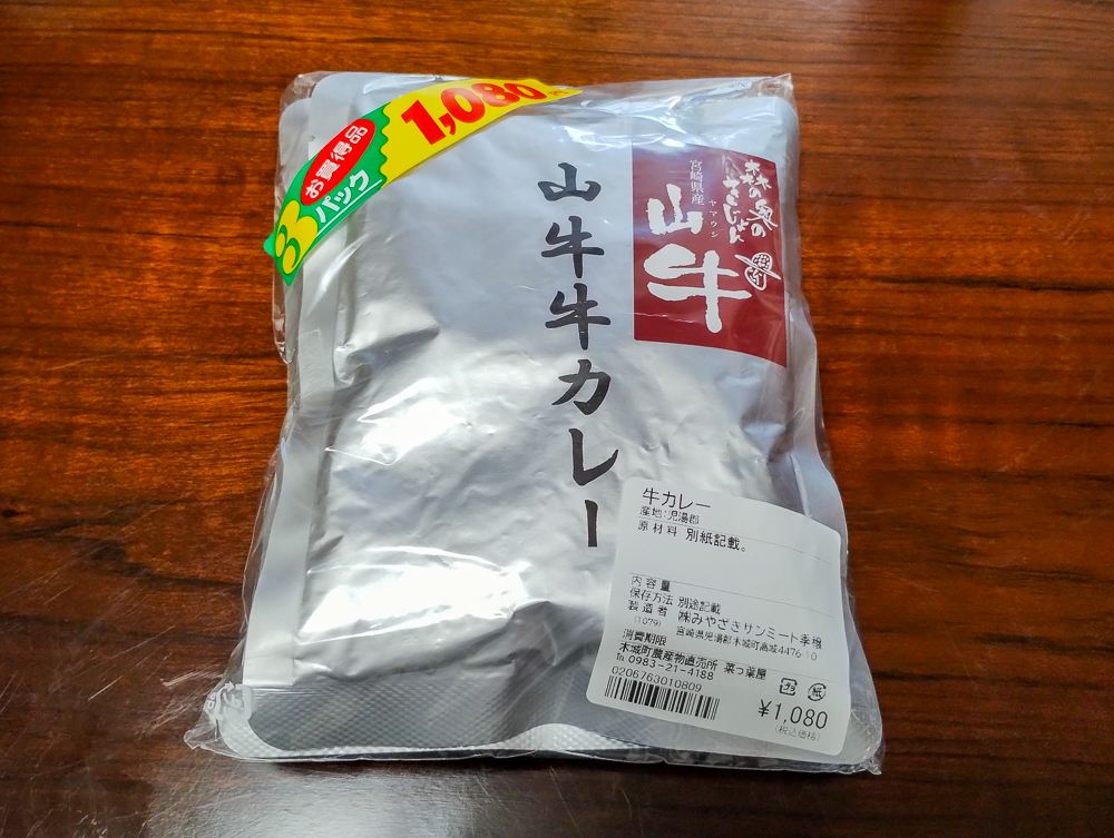 木城温泉隣の直売所「菜っ葉屋」で販売しているレトルトカレーです。3パック入りで1,080円とリーズナブル、しかも美味しいので家で常備しています。